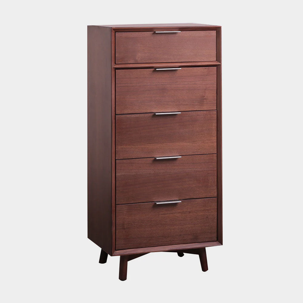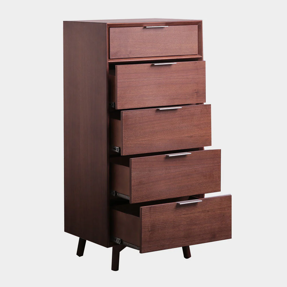 A Classic bedside table with five sliding drawers, mitered front edges and splayed legs in solid wood and MDF.